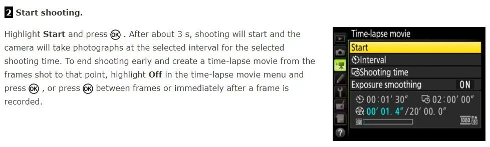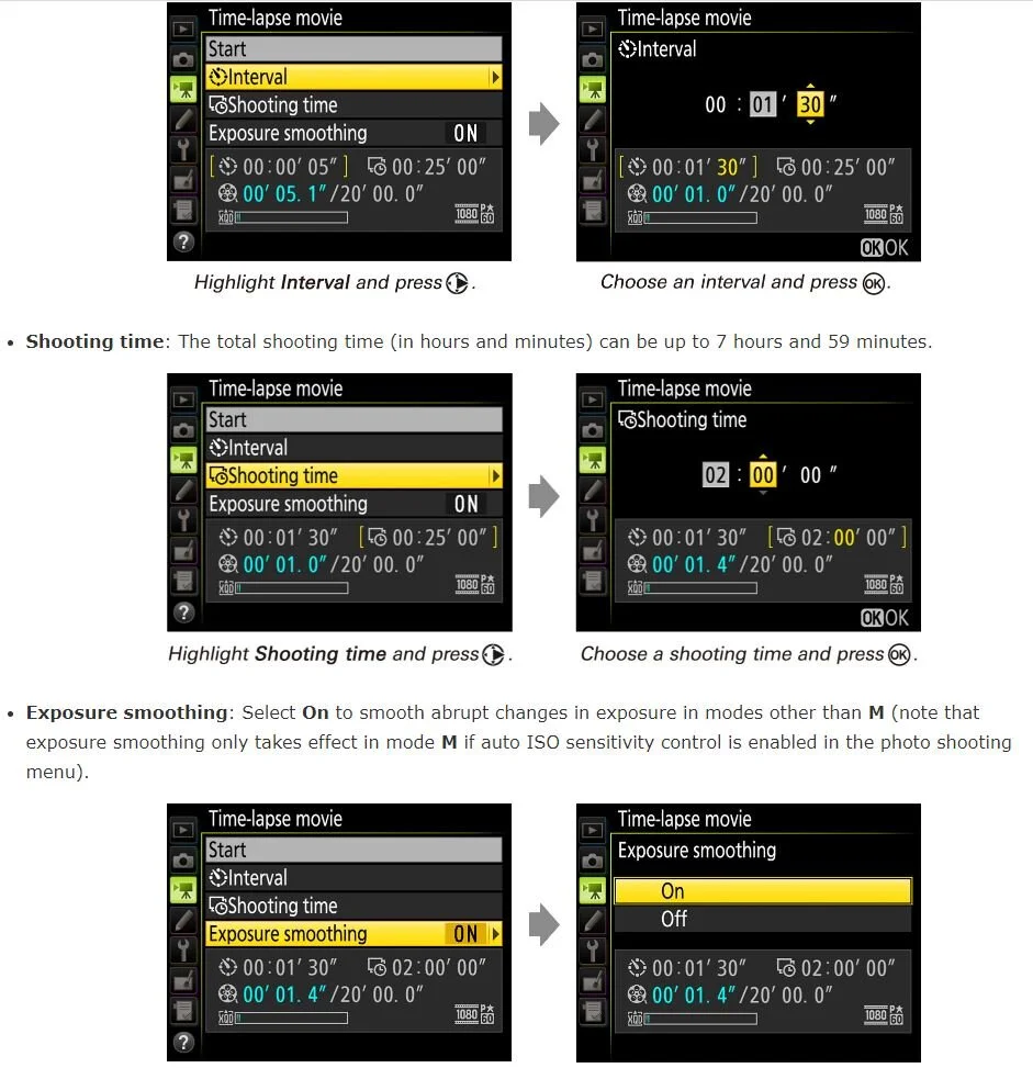 In interval-timer photography, the camera takes photos at preset intervals. Image quality, size, and other settings can be adjusted for exactly the results you want, while shots containing unwanted objects can be edited or deleted. You can create frames for high-quality movies and even (in NEF/RAW format) choose the color temperature.